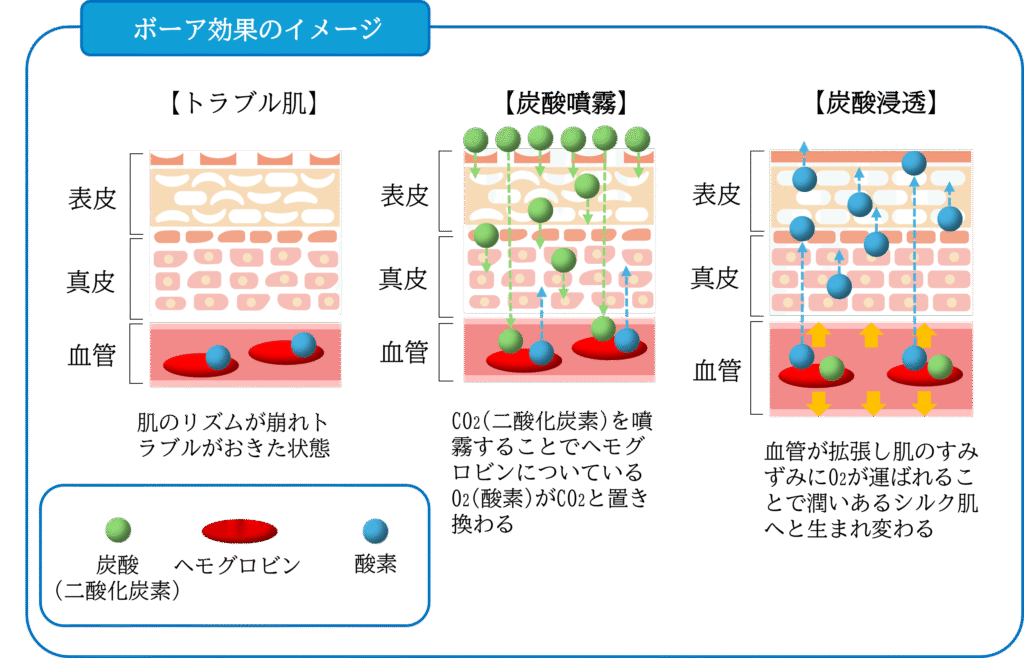 炭酸をお肌に噴きつけると、血液中の二酸化炭素濃度が増え、身体は酸素不足と認識します。ヘモグロビンは不足した酸素を大量に運び二酸化炭素と酸素を交換します。